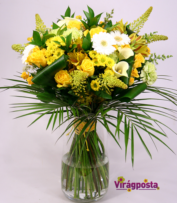 Összetételében a sárga rózsa a "biztos pont", a többi virág (Pl. alstroméria, sárga mini gerbera, sárga margaréta, frézia, solidago, sárga minirózsa, zöld szegfű, kála...), az aktuálisan rendelkezésünkre álló készletek függvényében változhat.