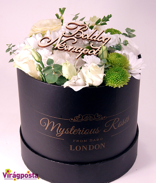 A Mysterious hengerdobozt most csodás krémfehér és zöld virágokkal szállítjuk.