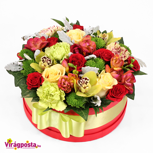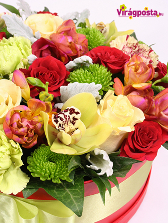 Színes rózsákkal, egzotikus orchideával, illatos fréziákkal, vidám santinikkel készítettük ezt a vibrálóan élénk kompozíciót.